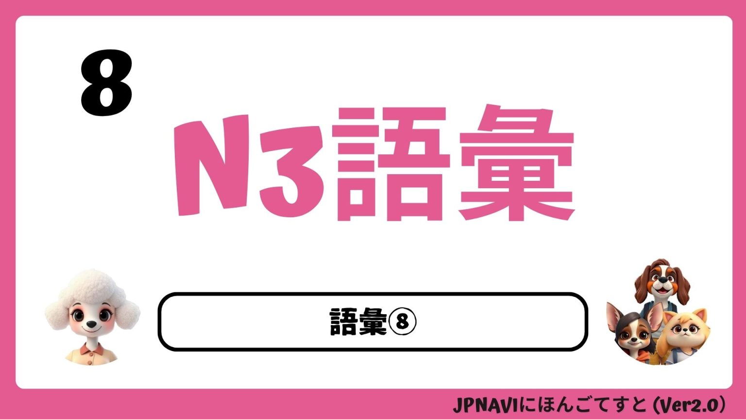 【会員限定かいいんげんてい】テストを送信そうしん、動画どうがを見たら、1ポイントを獲得かくとく! N3語彙8 2024.12.092025.10.13 このページはJPNAVI会員かいいんが使つかえます。This page can be used by JPNAVI members. 会員登録は無料です 無料むりょう会員登録かいいんとうろくをするSign up for a free member ログインする LINEでログインGoogleで続行 既存ユーザのログインユーザー名またはメールアドレスパスワード上に表示された文字を入力してください。Facebookで続行Googleで続行 ログイン状態を保存する パスワードを忘れた場合 パスワードリセットはじめての方はこちら 新規ユーザー登録